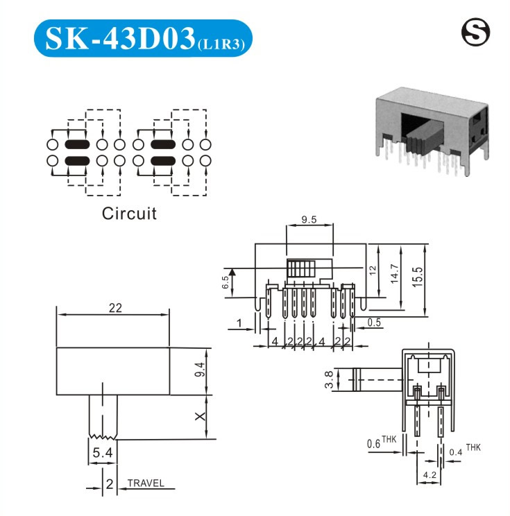 SK-43D03 詳細(xì)資料 產(chǎn)品說明: 技術(shù)指標(biāo): 使用溫度范圍 -20~+70℃ 耐壓 AC250V(50Hz)/min 額定負(fù)荷 DC 50V 0.5A 動(dòng)作力 250±100gf 接觸電阻 ≤0.05Ω 機(jī)械壽命 10000次 絕緣電阻 ≥100MΩ