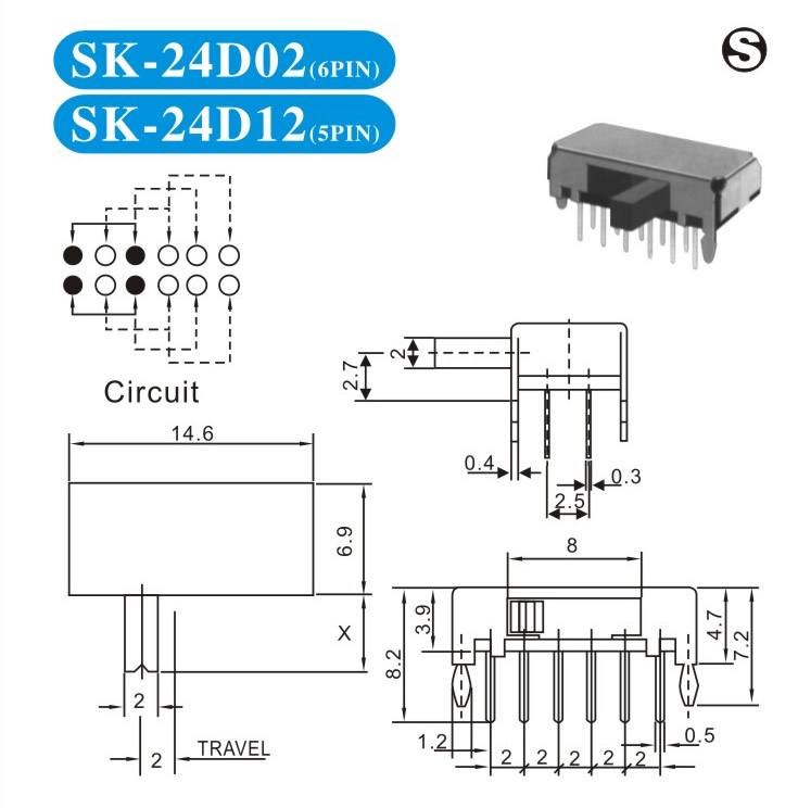 SK-24D02 詳細資料 產(chǎn)品說明: 技術(shù)指標(biāo): 使用溫度范圍 -20~+70℃ 耐壓 AC250V(50Hz)/min 額定負荷 DC 50V 0.5A 動作力 250±100gf 接觸電阻 ≤0.05Ω 機械壽命 10000次 絕緣電阻 ≥100MΩ