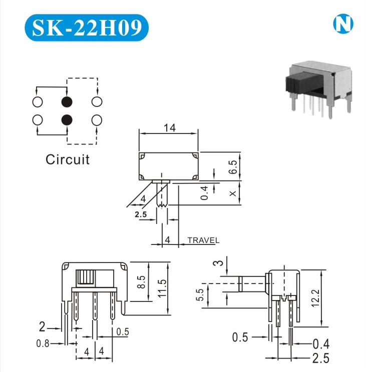 SK-22H09 詳細(xì)資料 產(chǎn)品說明: 技術(shù)指標(biāo): 使用溫度范圍 -20~+70℃ 耐壓 AC250V(50Hz)/min 額定負(fù)荷 DC 50V 0.5A 動作力 250±100gf 接觸電阻 ≤0.05Ω 機(jī)械壽命 10000次 絕緣電阻 ≥100MΩ
