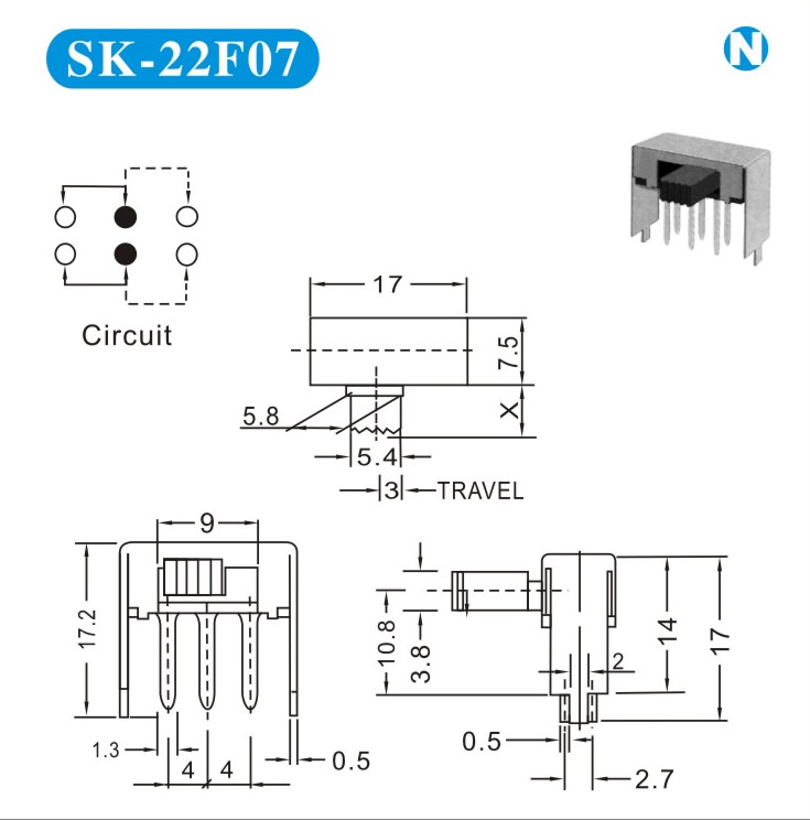 SK-22F07 詳細(xì)資料 產(chǎn)品說明: 技術(shù)指標(biāo): 使用溫度范圍 -20~+70℃ 耐壓 AC250V(50Hz)/min 額定負(fù)荷 DC 50V 0.5A 動作力 250±100gf 接觸電阻 ≤0.05Ω 機(jī)械壽命 10000次 絕緣電阻 ≥100MΩ