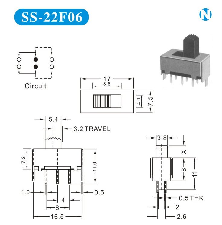 SS-22F06 詳細(xì)資料 產(chǎn)品說明: 技術(shù)指標(biāo): 使用溫度范圍 -20~+70℃ 耐壓 AC250V(50Hz)/min 額定負(fù)荷 DC 50V 0.5A 動(dòng)作力 250±100gf 接觸電阻 ≤0.05Ω 機(jī)械壽命 10000次 絕緣電阻 ≥100MΩ