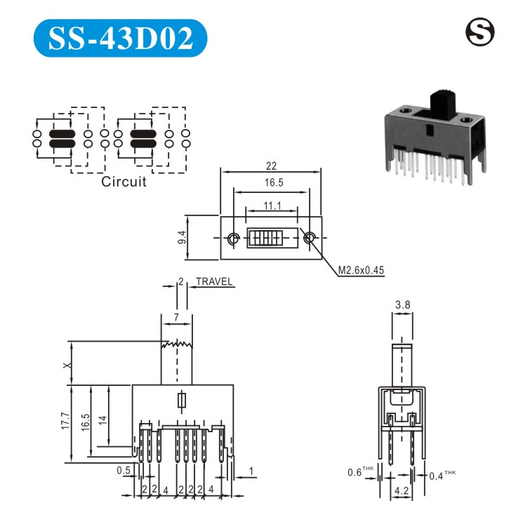 SS-43D02 詳細(xì)資料 產(chǎn)品說明: 技術(shù)指標(biāo): 使用溫度范圍 -20~+70℃ 耐壓 AC250V(50Hz)/min 額定負(fù)荷 DC 50V 0.5A 動作力 250±100gf 接觸電阻 ≤0.05Ω 機(jī)械壽命 10000次 絕緣電阻 ≥100MΩ