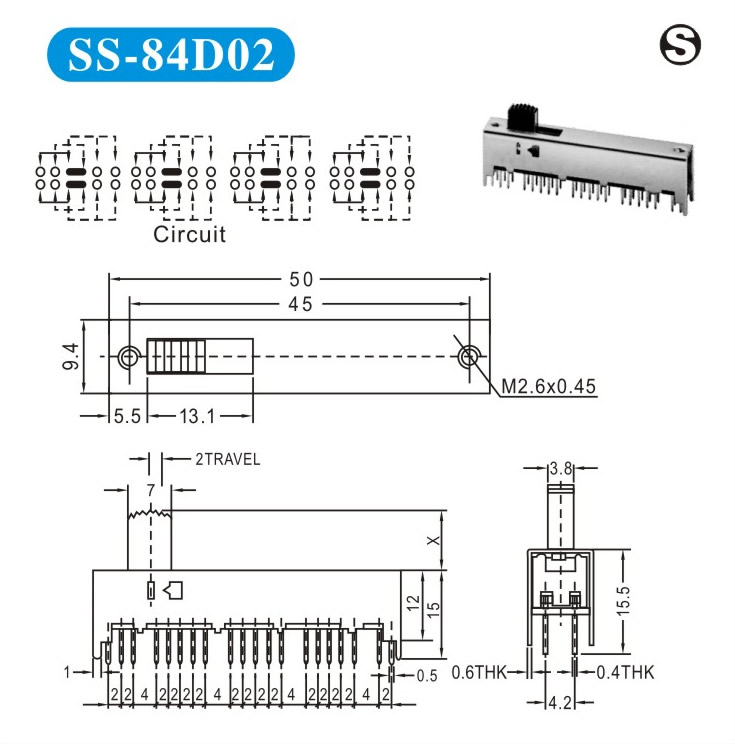 SS-84D02 詳細(xì)資料 產(chǎn)品說明: 技術(shù)指標(biāo): 使用溫度范圍 -20~+70℃ 耐壓 AC250V(50Hz)/min 額定負(fù)荷 DC 50V 0.5A 動作力 250±100gf 接觸電阻 ≤0.05Ω 機(jī)械壽命 10000次 絕緣電阻 ≥100MΩ